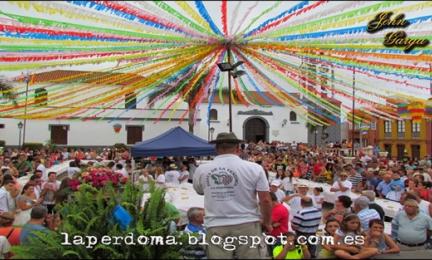 In the populous La Orotava neighbourhood of La Perdoma, the festivities in honour of Nuestra Señora del Rosario and San Jerónimo are held each year in the first week of October. These celebrations are characterized by the grape harvest, with acts such as the Bread and Chorizo day, a multitudinous celebration, which takes place along with the Craft Fair and the Harvest Festival as well as the election of the Queen. Children have the opportunity of pressing the grapes with their bare feet, and they enjoy it very much, since the vast majority of them are unaware of the process of artisanal winemaking. There are many visitors who enjoy this bread and chorizo, as well as other local products like kneaded gofio (roast and ground cereals, normally wheat and/or corn), bananas and fruits, lupine, etc.