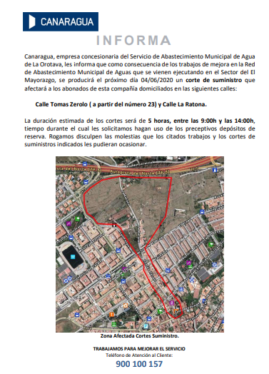 Con motivo de las obras de mejora que se ejecutan en el sector de El Mayorazgo, se ha programado un corte del suministro de agua el jueves 4 de junio, entre las 9.00 y las 14:00 horas, afectando la los abonados de la Calle Tomás Zerolo y toda la calle La Ratona.