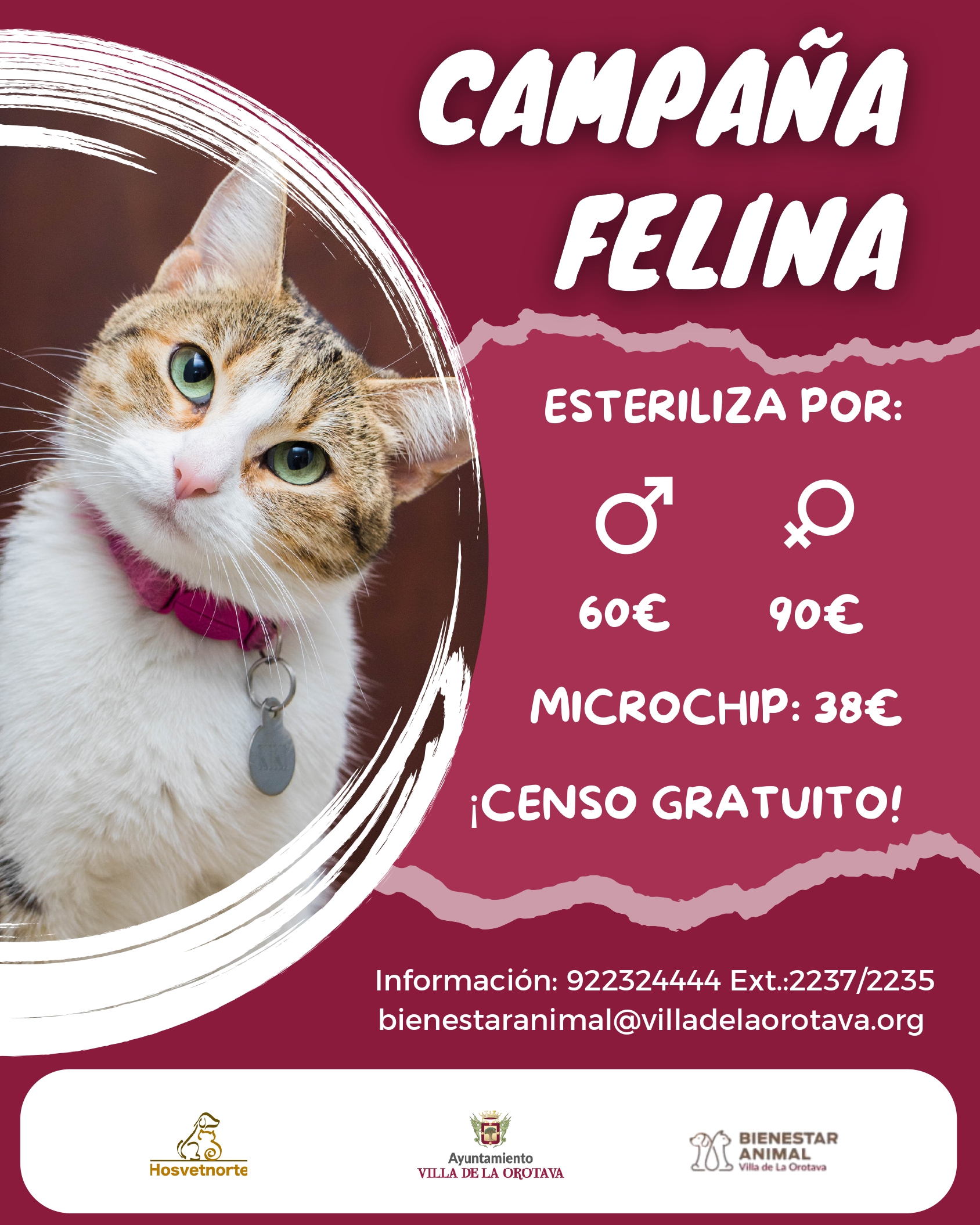 Más información: 922 32 44 44 (Ext. 2237 / 2235 / 2210) bienestaranimal@villadelaorotava.org