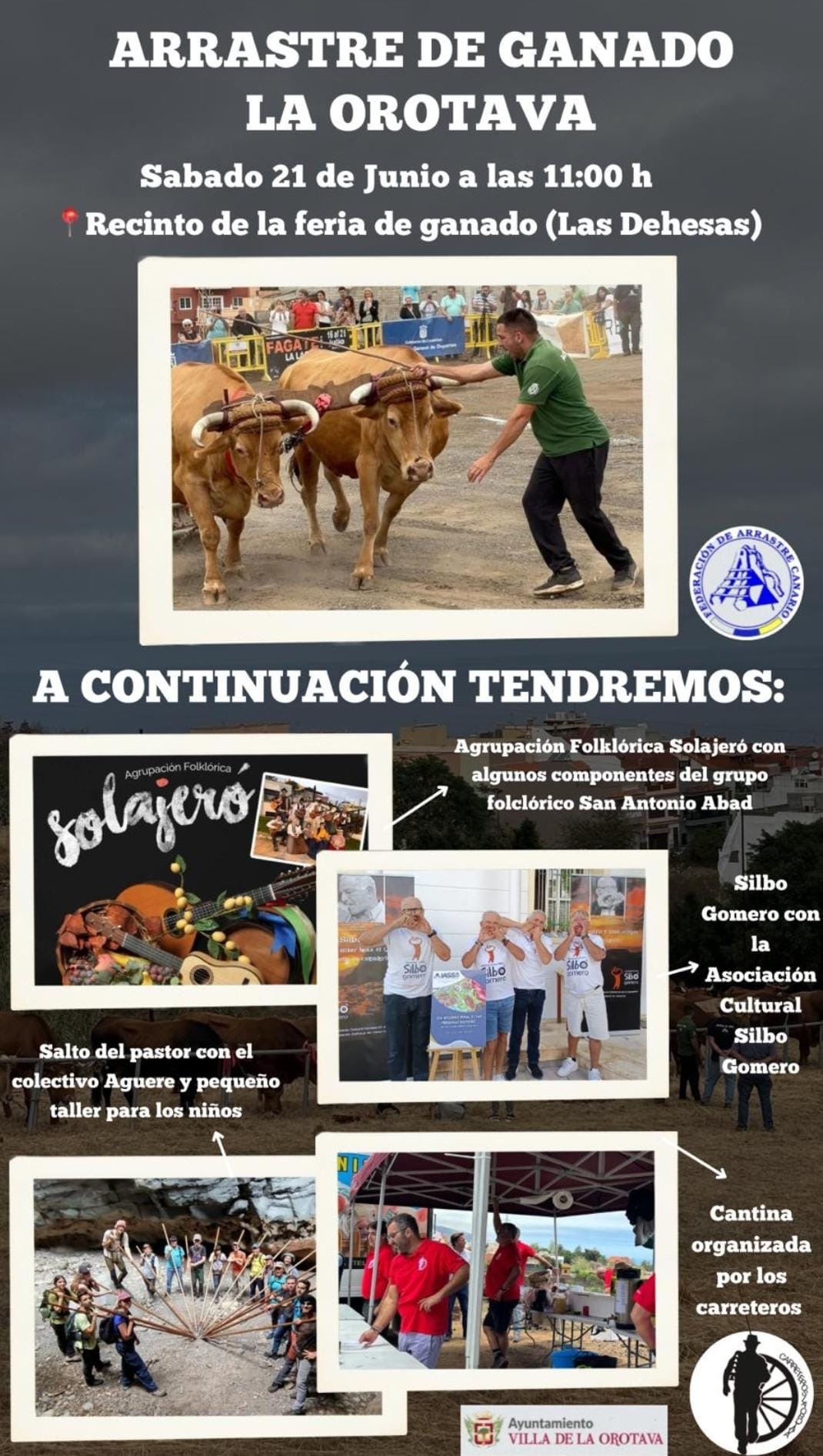 El próximo sábado 21 de junio, a partir de las 11:00 horas, el Recinto de la Feria de Ganado (Las Dehesas) acoge una nueva edición del tradicional Arrastre de Ganado de La Orotava, un evento que rinde homenaje a nuestras raíces rurales y a la cultura canaria.
