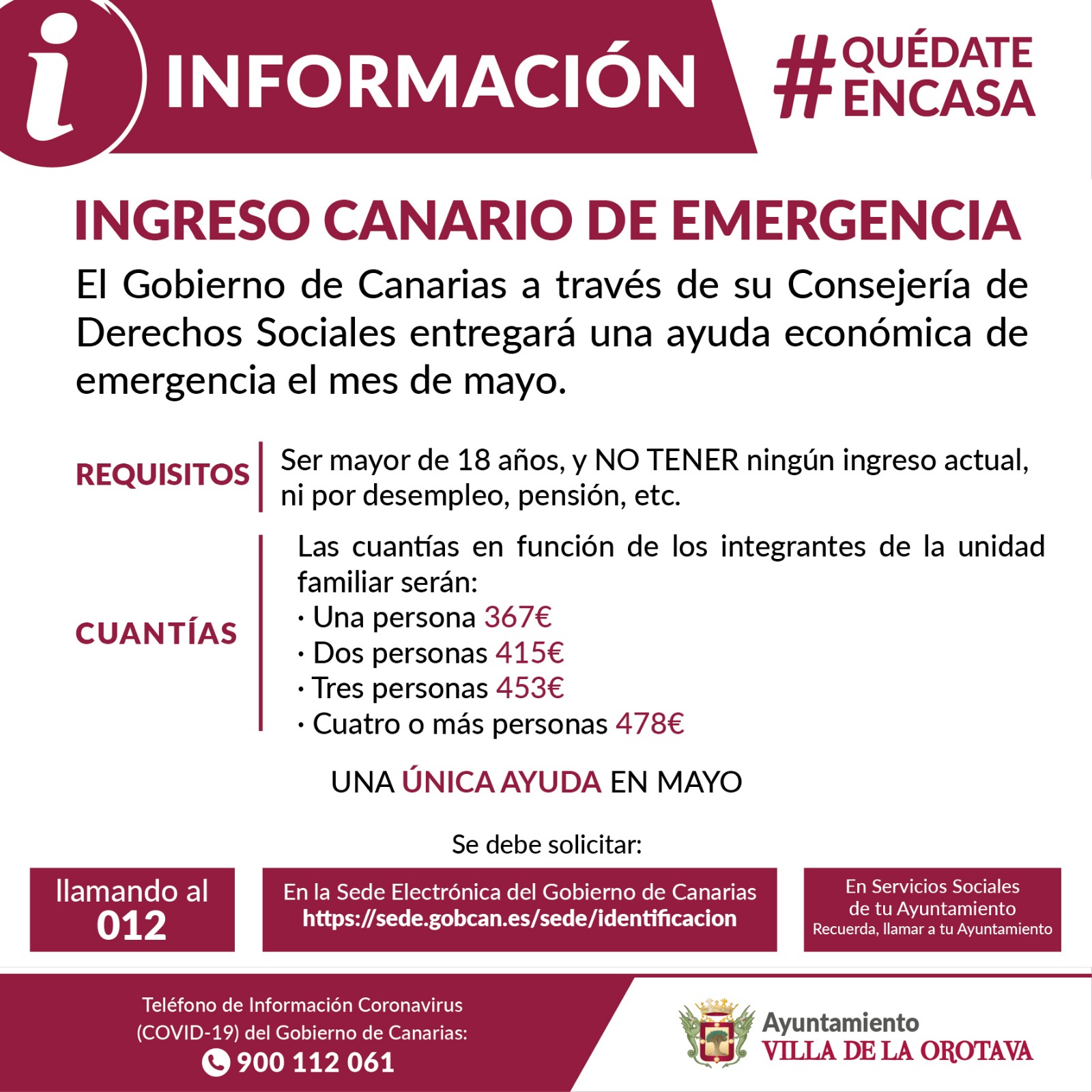 El Gobierno de Canarias entregará una Ayuda Económica de Emergencia, en el mes de mayo, SOLO en el caso de no tener ningún ingreso, ni por desempleo, ni pensión... Se debe ser mayor de 18 años. Y será una única ayuda en el citado mes de mayo. Las ayudas dependerán de los integrantes de la familia.
