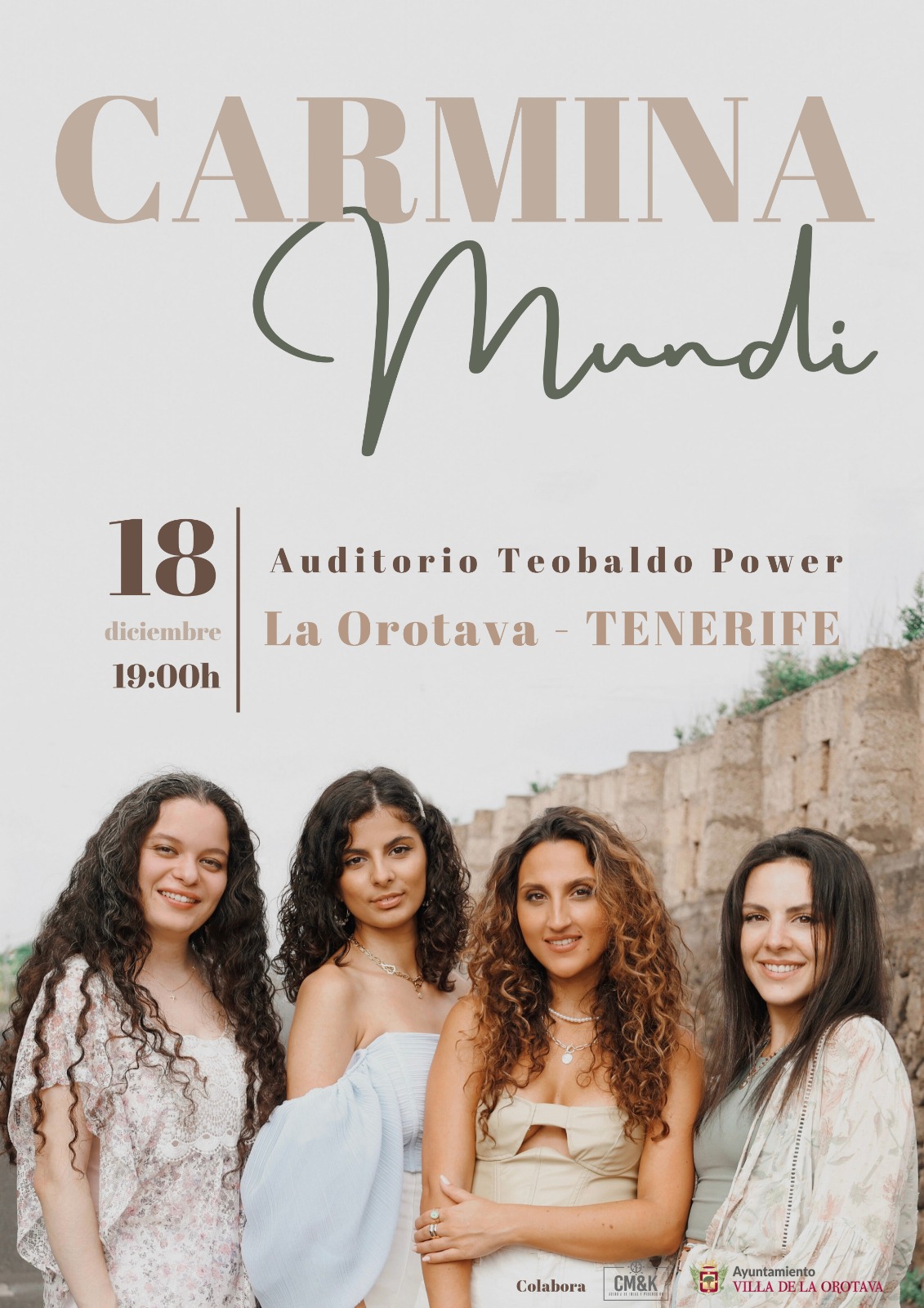Fecha/Hora: Domingo, 18 Diciembre, 2022Lugar: Auditorio Teobaldo Power La OrotavaDescripción: La agrupación musical Carmina Mundi actuará el próximo 18 de diciembre a las 19:00h en el Auditorio Teobaldo Power