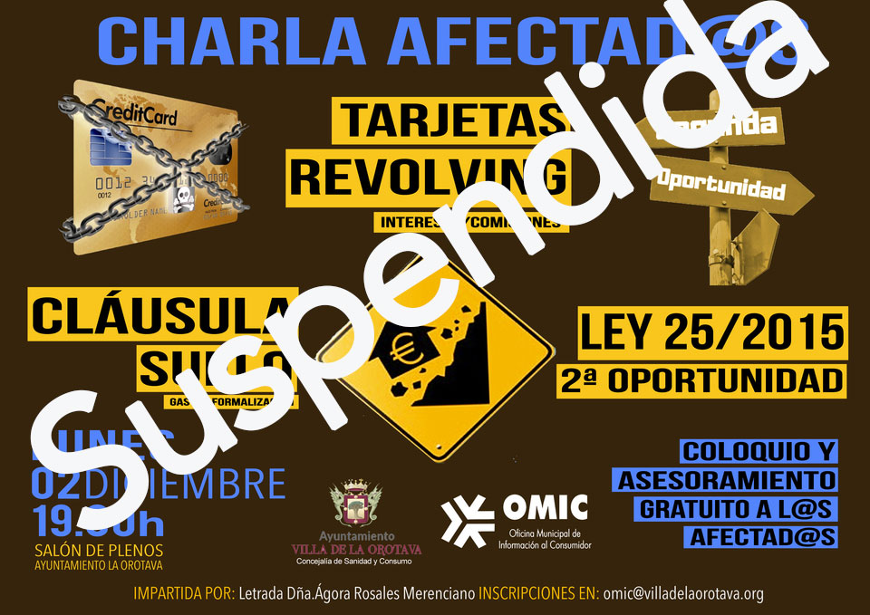 La temática a tratar son las tarjetas revolving (intereses/comisiones), cláusulas suelo, y Ley 25/2015 2ª oportunidad, temas de interés, por lo que se prevé aplazar la charla. Y a las personas que ya estaban inscritas o interesadas en participar se ruega se pongan en contacto con la Oficina municipal de Información al Consumidor