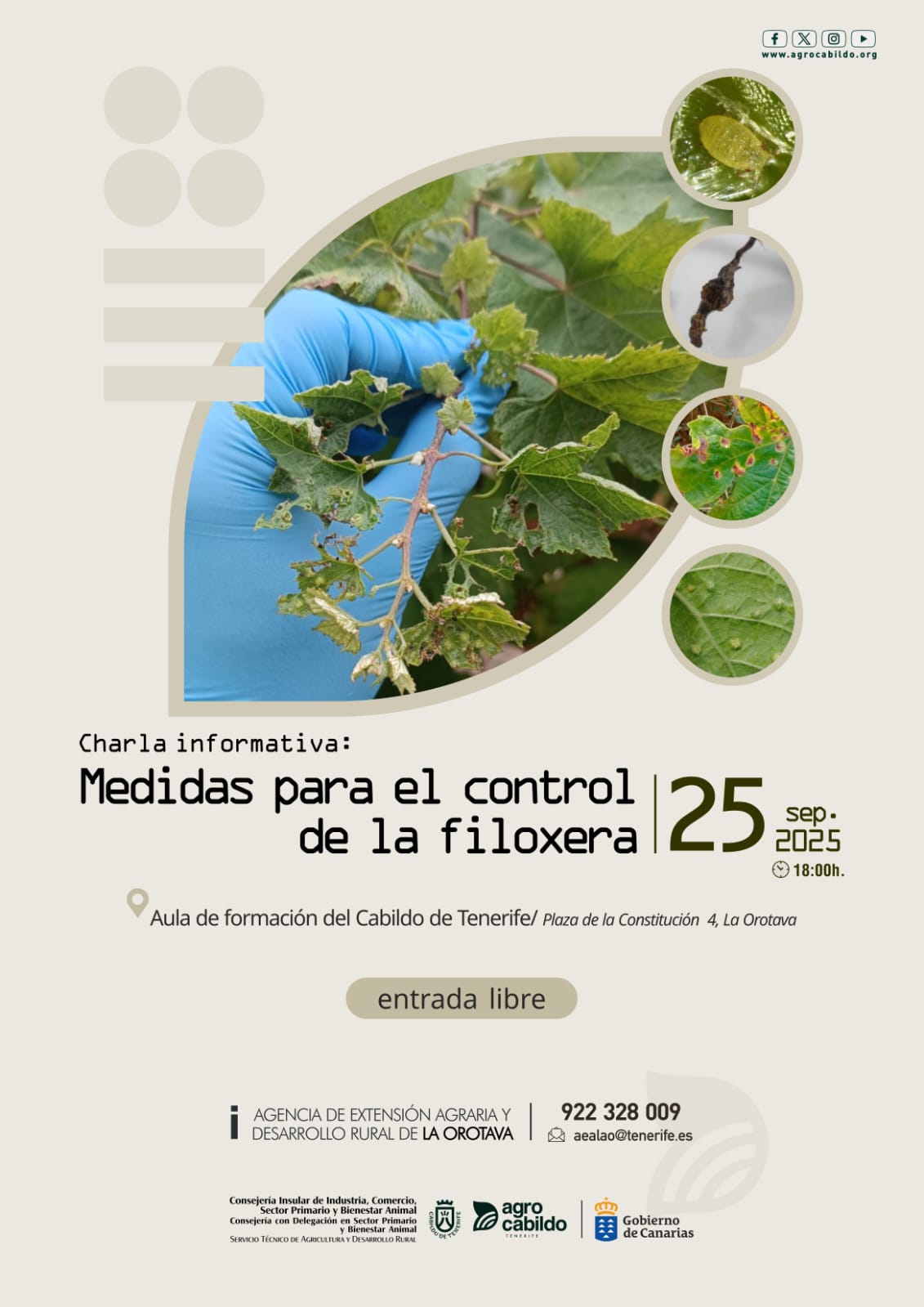 El próximo 25 de septiembre a las 18:00 horas, el Aula de Formación del Cabildo de Tenerife en La Orotava acoge la charla informativa “Medidas para el control de la filoxera”. Un encuentro dirigido al sector vitivinícola y personas interesadas en la sanidad vegetal, donde se abordarán estrategias para la detección y control de esta plaga que afecta a los viñedos. La entrada es libre hasta completar aforo.