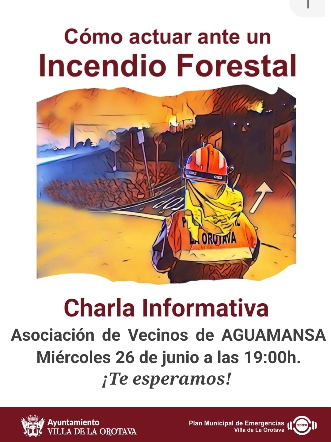 El miércoles 26 de junio tendrá lugar en la Asociación de Vecinos de Aguamansa, una charla informativa acerca de como actuar ante un incendio forestal, a partir de las 19:00 horas.