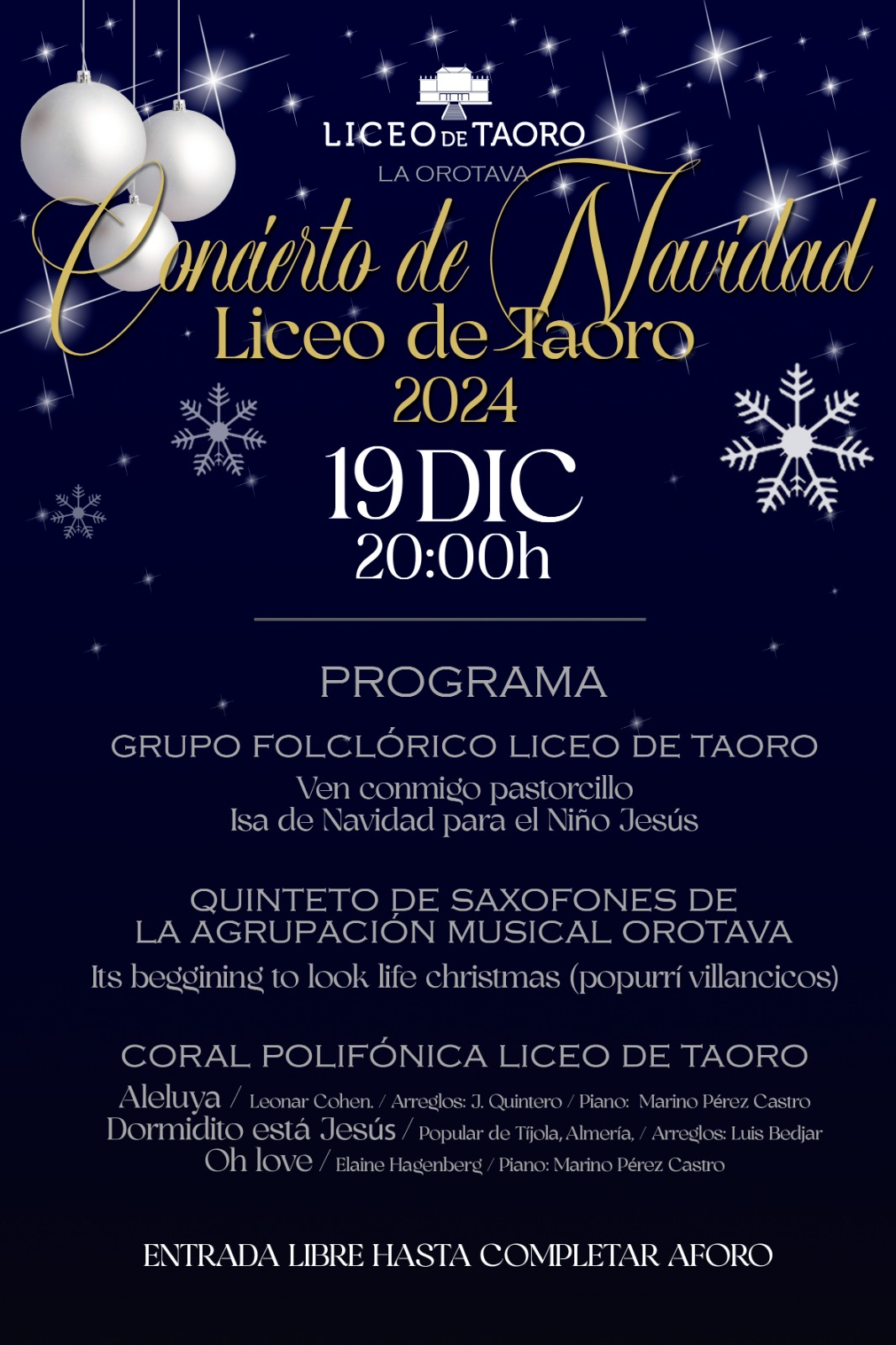 Te invitamos al Concierto de Navidad del Liceo de Taoro en La Orotava, el próximo 19 de diciembre a las 20:00h. Disfruta de un programa especial con: • Grupo Folclórico Liceo de Taoro • Quinteto de Saxofones de la Agrupación Musical Orotava • Coral Polifónica Liceo de Taoro