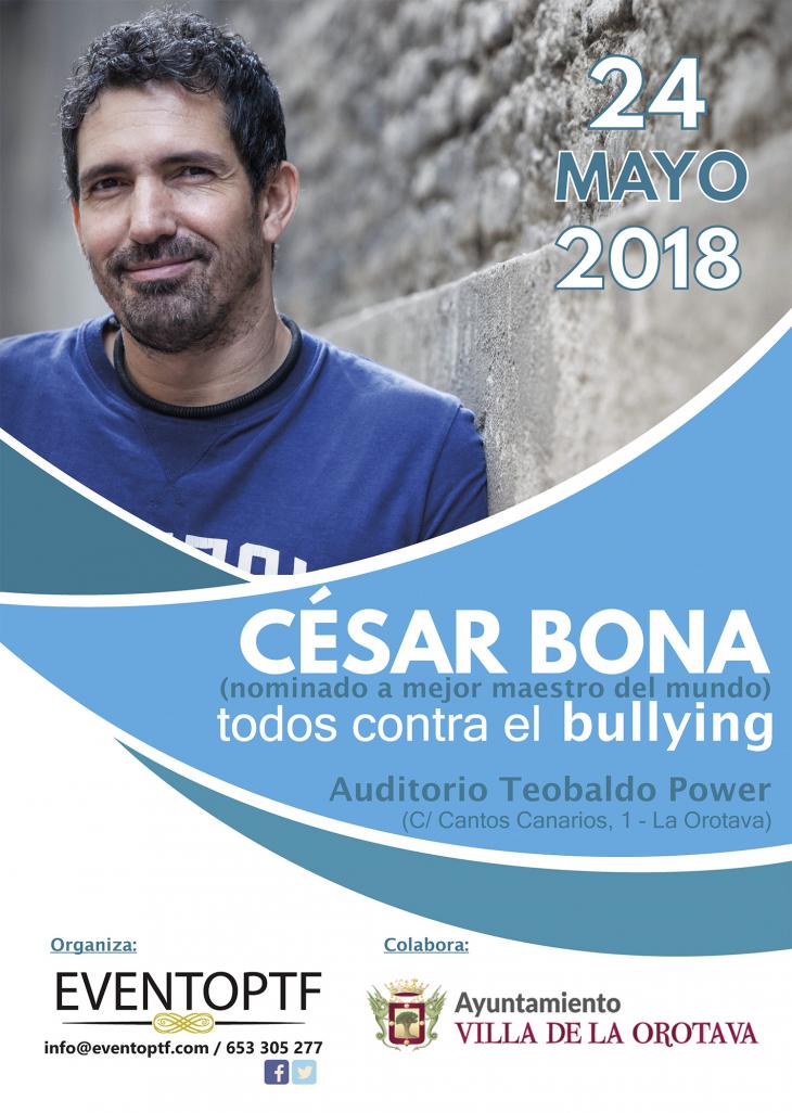 La empresa Eventoptf, compuesta por un equipo de profesionales dedicados a la organización de eventos en Canarias, con la colaboración del Ayuntamiento de la Orotava (Concejalía de Educación y Área Bienestar Social) prepara este un nuevo acontecimiento dirigido a educadores, docentes, estudiantes (a partir de 9 años), padres, madres, etc. Con el objetivo de orientar en la planificación y toma de decisiones tanto personales como educativas contra el acoso escolar. Donde tendremos como ponente al maestro César Bona (nominado al premio Mejor Maestro del Mundo), que bajo la temática ‘todos contra el bullying”, tratará las bases para que entre toda la comunidad educativa (padres y madres, alumnos, maestros e instituciones) podamos tomar conciencia de lo serio y perjudicial que es este problema que afecta a miles de niños en las aulas y que, entre todos, debemos erradicar.