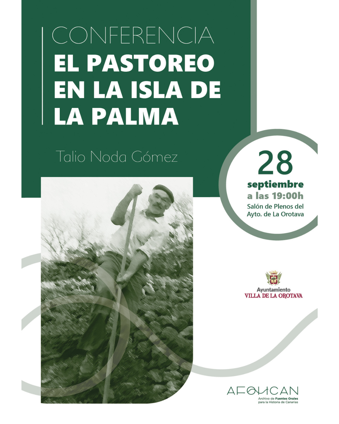 El folklorista palmero Talio Noda Gómez  ofrecerá el próximo 28 de septiembre, a las 19:00 horas, en el Salón de Plenos del ayuntamiento de La Orotava, una conferencia sobre "El Pastoreo en la isla de La Palma", invitado por el Archivo de Fuentes Orales para la Historia de Canarias (AFOHCAN) y en colaboración con el consistorio villero.