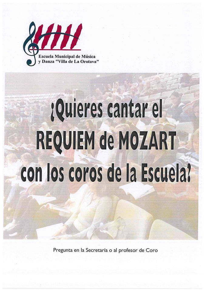 Si quieres cantar el Requiem de Mozart con los Coros de la Escuela Municipal de Música de la Villa de La Orotava no pierdas la oportunidad e inscríbete. Comienzan a ensayar esta semana, y solo tienes que informarte en la propia Escuela en la Plaza de la Constitución, 2 o llamando al 922 32 13 79