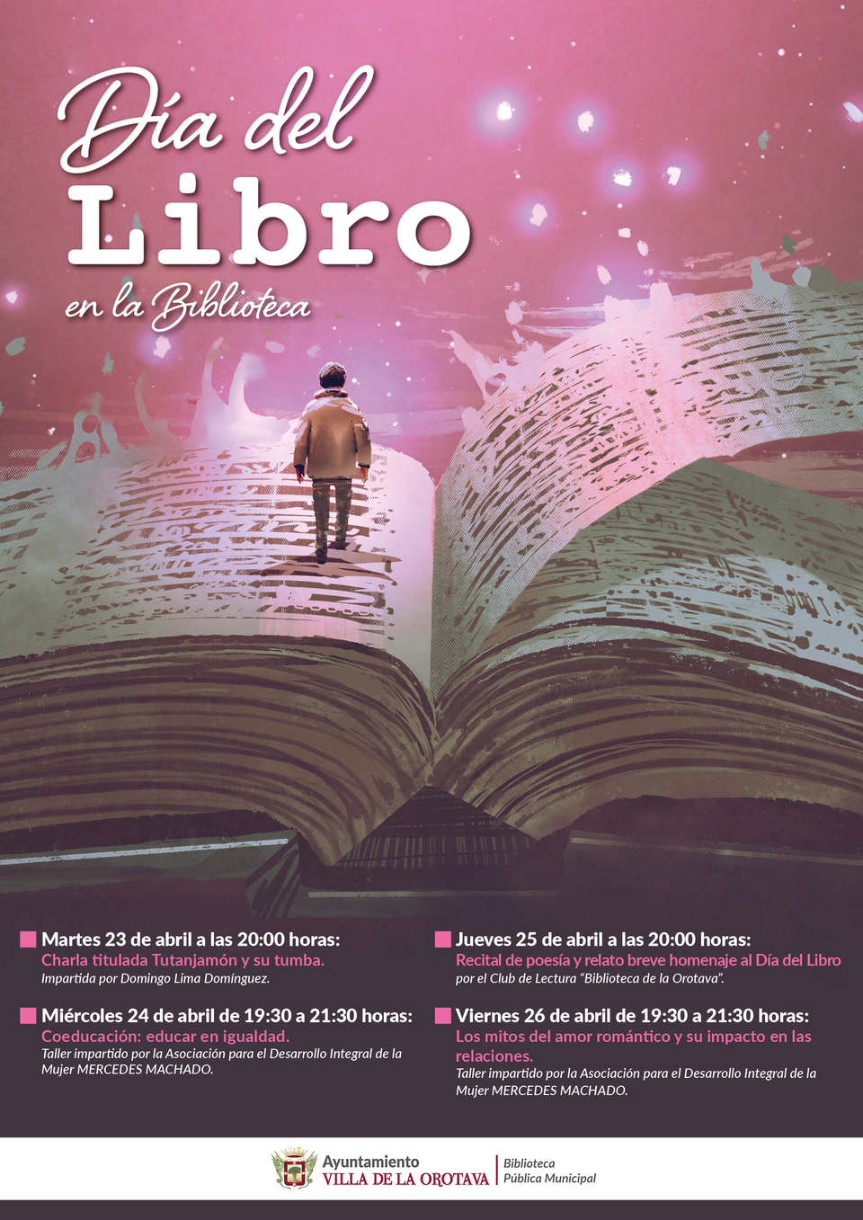 En primer lugar, este martes 23 de abril, Día del Libro, a las 20'00 horas se ofrecerá una charla titulada Tutanjamón y su tumba impartida por Domingo Lima Domínguez. En segundo lugar, el miércoles 24 a las 19'30 horas se llevará a cabo un taller sobre políticas de Igualdad denominado Coeducación: educar en igualdad, por la  Asociación para el Desarrollo Integral de la Mujer MERCEDES MACHADO.  El jueves 24 de abril a las 20'00 horas tendrá lugar un Recital de poesía y relato breve homenaje al Día del Libro, por el Club de Lectura "Biblioteca de la Orotava".  Y por último, el viernes 26 de abril a las 19'30 horas se llevará a cabo un segundo taller sobre Políticas de Igualdad denominado Los mitos del amor romántico y su impacto en las relaciones por la  Asociación para el Desarrollo Integral de la Mujer MERCEDES MACHADO.  Todas las actividades que recogen este Programa son gratuitas y no requieren inscripción previa.