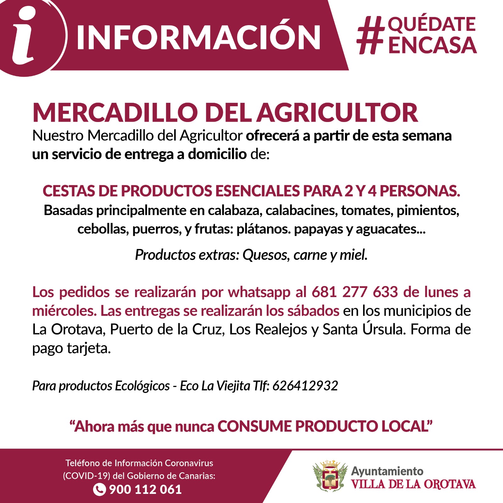 El Mercadillo del Agricultor ofrecerá a partir de esta semana un servicio de entrega a domicilio de cestas de productos esenciales para 2 y 4 personas. Basadas principalmente en calabaza, calabacines, tomates, pimientos, cebollas, puerros, y frutas: plátanos. papayas y aguacates...