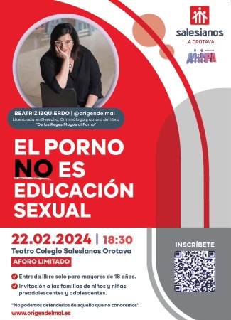 Jueves 22 de febrero a las 18.30h, en el Teatro del Colegio Salesiano-San Isidro de La Orotava, charla formativa para padres, madres y tutores de alumnos/as de 5º y 6º de Primaria de todos los Centros Educativos del Casco Histórico de La Orotava.  Una ponencia de Beatriz Izquierdo, licenciada en Derecho, criminóloga y afamada autora del libro “De los Reyes Magos al porno”.