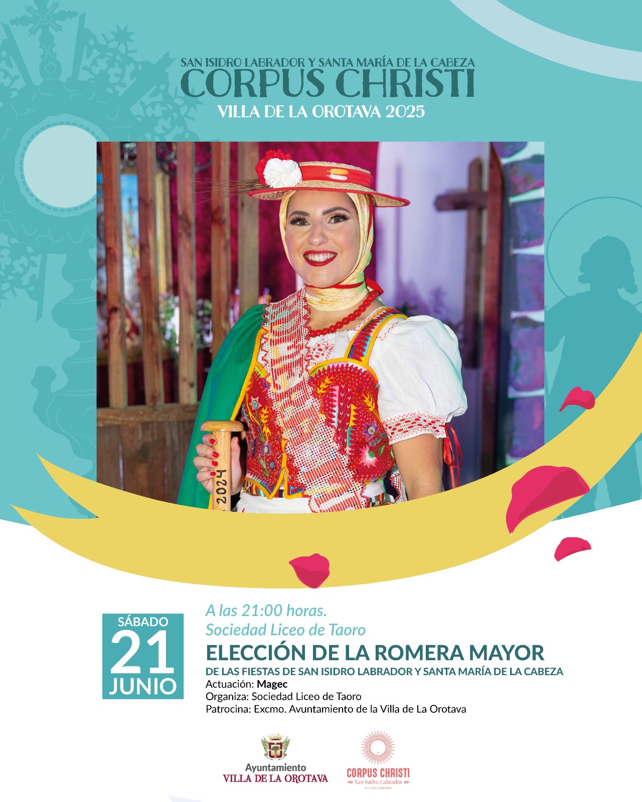 Te invitamos a vivir una de las tradiciones más entrañables de nuestra villa: la Elección de la Romera Mayor, enmarcada dentro de las fiestas patronales en honor a San Isidro Labrador y Santa María de la Cabeza.