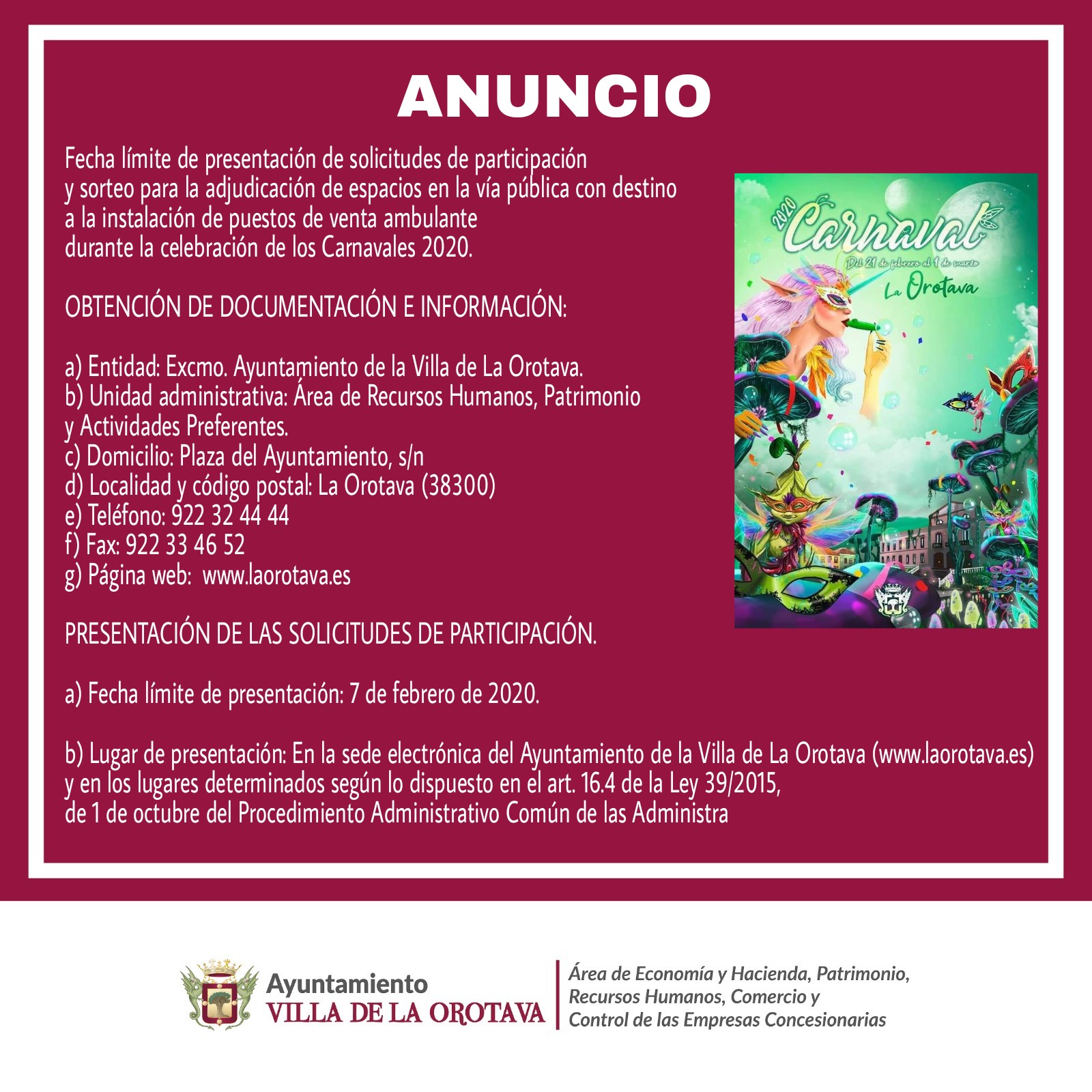 Fecha límite presentación de solicitudes para participar y sorteo de espacios en la via pública - Carnaval