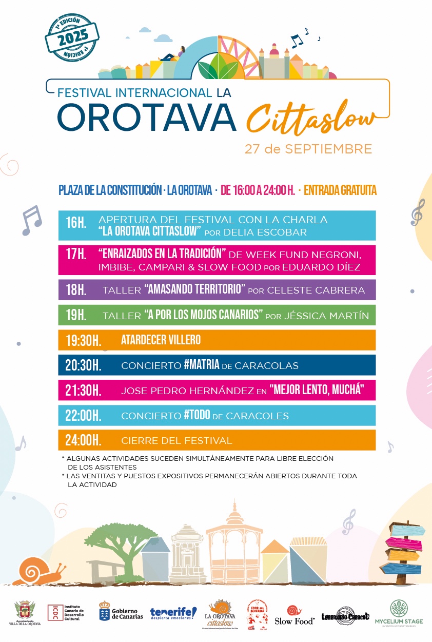 El próximo 27 de septiembre la Plaza de la Constitución acoge una nueva edición del Festival Internacional La Orotava Cittaslow. Una jornada única, de 16:00 a 24:00 horas, con entrada gratuita, que combina charlas, talleres, atardeceres con encanto y conciertos inolvidables.
