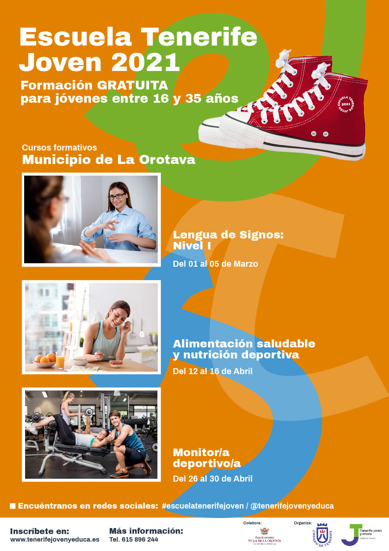 El Ayuntamiento de La Orotava, a través de la concejalía de Juventud, pone a disposición de la juventud villera la Escuela Tenerife Joven 2021, un recurso educativo del Cabildo Insular de Tenerife que permitirá a edades comprendidas entre 16 y 35 años mejorar su formación y cualificación profesional para que puedan adquirir nuevas competencias y habilidades para el empleo.
