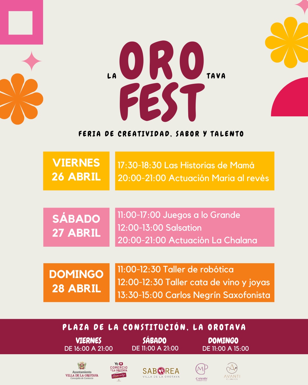 La I edición de Canary Market Place bajo la denominación de 'La Orotava Fest’, llega al municipio villero los días 26, 27 y 28 de abril y tendrá lugar en la Plaza de la Constitución. A lo largo de esos tres días se contará con actividades para todos los públicos; actuaciones musicales; masterclass salsation; taller de robótica, talleres de cata de vinos y joyas, etc.