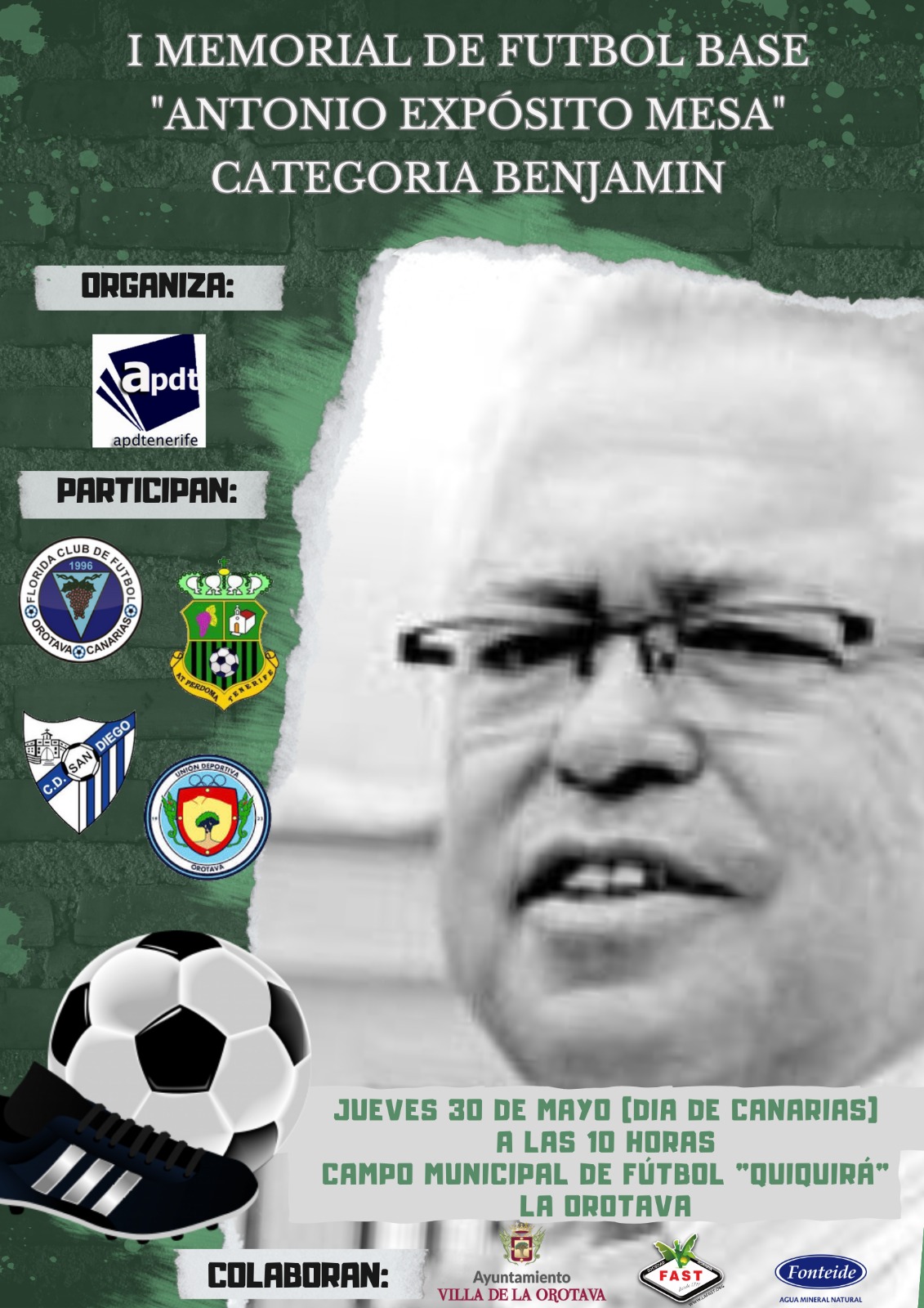 El jueves 30 de Mayo, a partir de las 10:00 horas se celebrará el primer Memorial de Fútbol Base "Antonio Expósito Mesa" (categoría benjamin). Participarán 4 clubes de La Orotava.