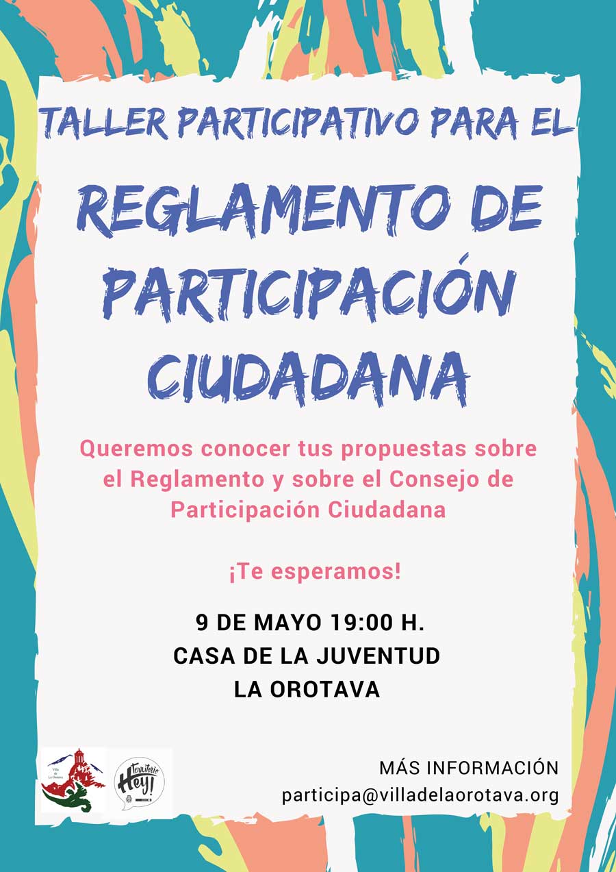 Después de habernos acercado a las Asociaciones para presentarles el borrador inicial, se abrió un plazo para presentar sugerencias, que finalizará el próximo miércoles 9 de mayo. Ahora, es el momento de poder debatir las aportaciones recibidas, y para ello vamos a celebrar un Segundo Taller el próximo miércoles 9 de mayo, a las 19:00 horas, en la Casa de la Juventud. En este encuentro, además de poner en común las aportaciones recibidas, también aprovecharemos para definir la organización y funcionamiento del Consejo Ciudadano Municipal, como órgano de participación de máxima representación vecinal.