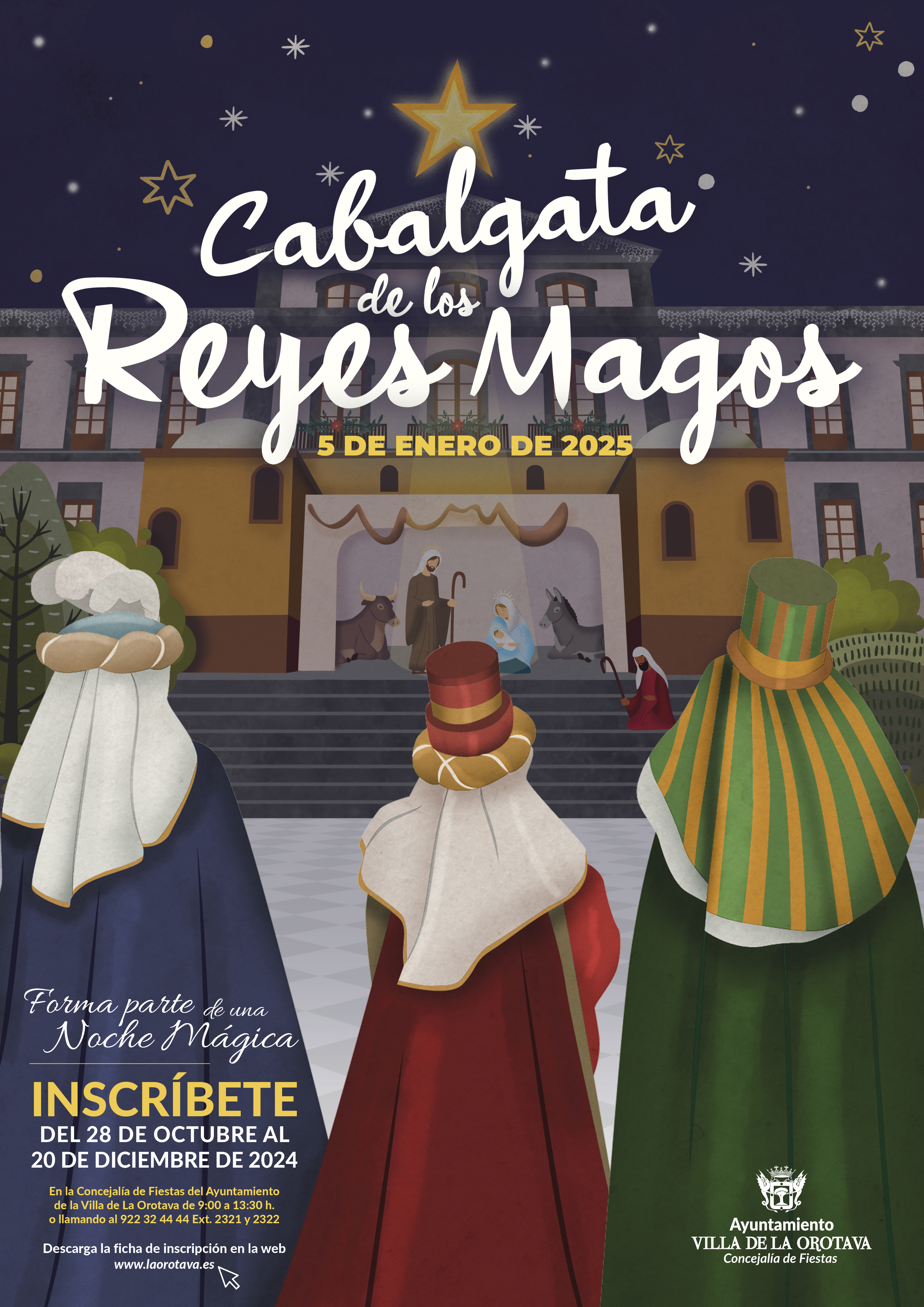 Las inscripciones para participar en la Cabalgata de Reyes Magos 2025 ya están abiertas. Únete a esta tradición y vive la emoción desde dentro mientras acompañas a Melchor, Gaspar y Baltasar en su recorrido por la Villa de La Orotava.
