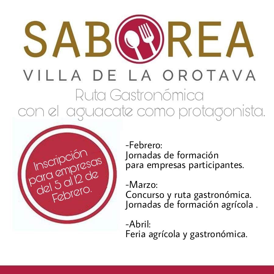 Fecha/Hora: Lunes, 5 Febrero, 2018Lugar: La Orotava BASES Inscripción para participar en la ruta gastronómica del aguacate - Saborea 2018