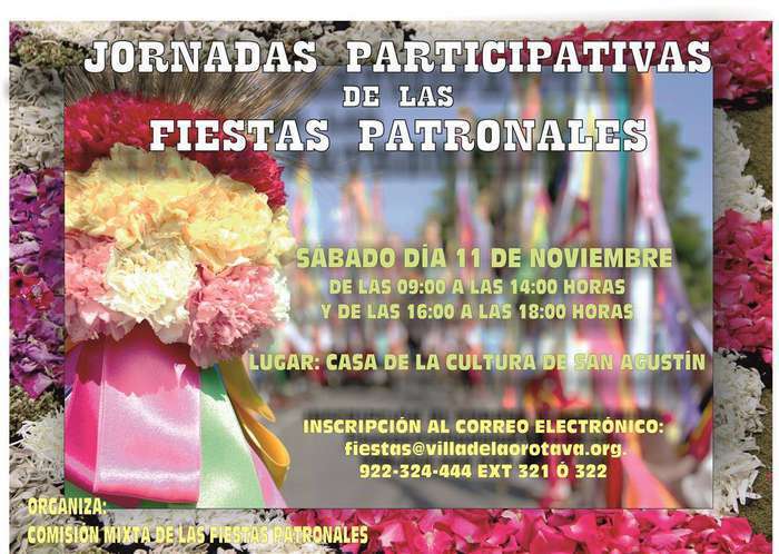 El Ayuntamiento, a través de la Concejalía de Fiestas, y la Comisión Mixta de las Fiestas de La Orotava—conformada por los distintos colectivos vinculados a las mismas como son la Asociación de Alfombristas; Hermandad de Labradores; Liceo de Taoro; colectivo cultural La Escalera y representantes de la Iglesia Matriz de La Concepción, de los grupos folclóricos, de las asociaciones juveniles, de las asociaciones de vecinos y de los distintos partidos políticos con representación municipal, entre otros— organizan para el sábado 11 de noviembre, las segundas jornadas de debate sobre las principales y populares fiestas del municipio, la Infraoctava del Corpus Christi y en honor a los Santos Patronos, San Isidro Labrador y Santa María de la Cabeza.