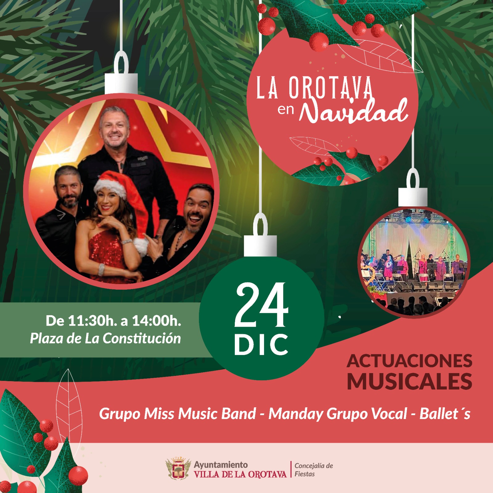 Disfruta de actuaciones musicales de: Grupo Miss Music Band - Manday Grupo Vocal - Ballet's, el próximo 24 de diciembre.