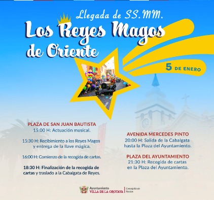Fecha/Hora: Jueves, 5 Enero, 2023Lugar: Avenida Mercedes PintoEl día 5 de enero tendrá lugar el acto de recepción de los Reyes Magos en la Villa.fiestas