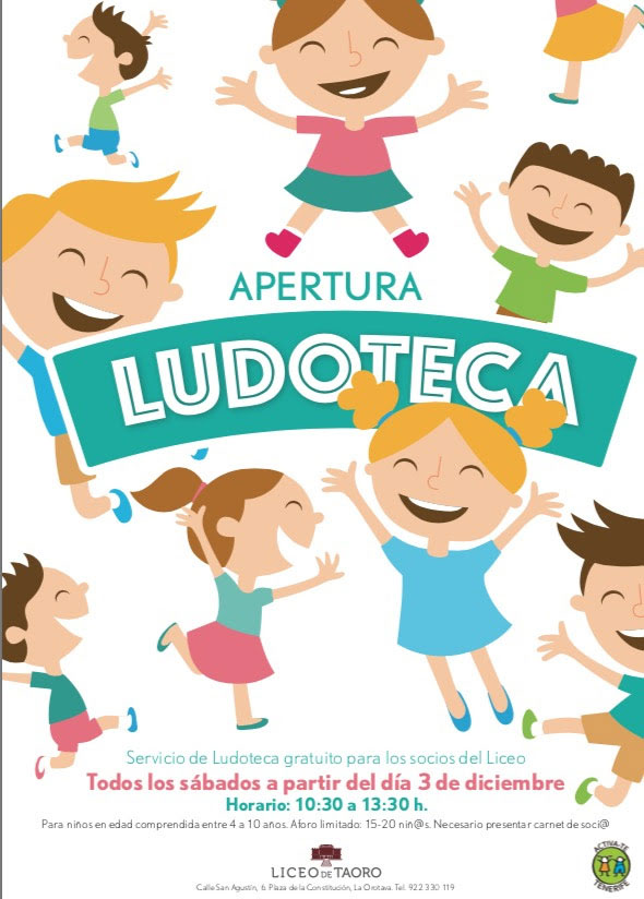 El Liceo de Taoro pone a disposición de sus socios un servicio de ludoteca gratuito para sus hijos, que estará abierto todos los sábados en horario de 10.30-13.30 y el día 5 del mes de diciembre que los niños no tienen cole.