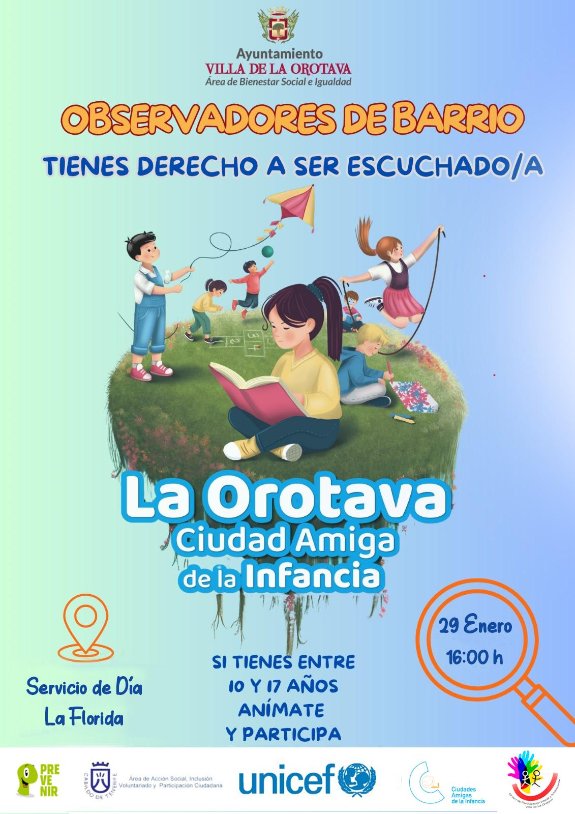 Observadores de Barrio: Participación juvenil en La Orotava El Ayuntamiento de La Orotava, en colaboración con UNICEF y el programa Ciudad Amiga de la Infancia, lanza la iniciativa Observadores de Barrio, dirigida a jóvenes entre 10 y 17 años.