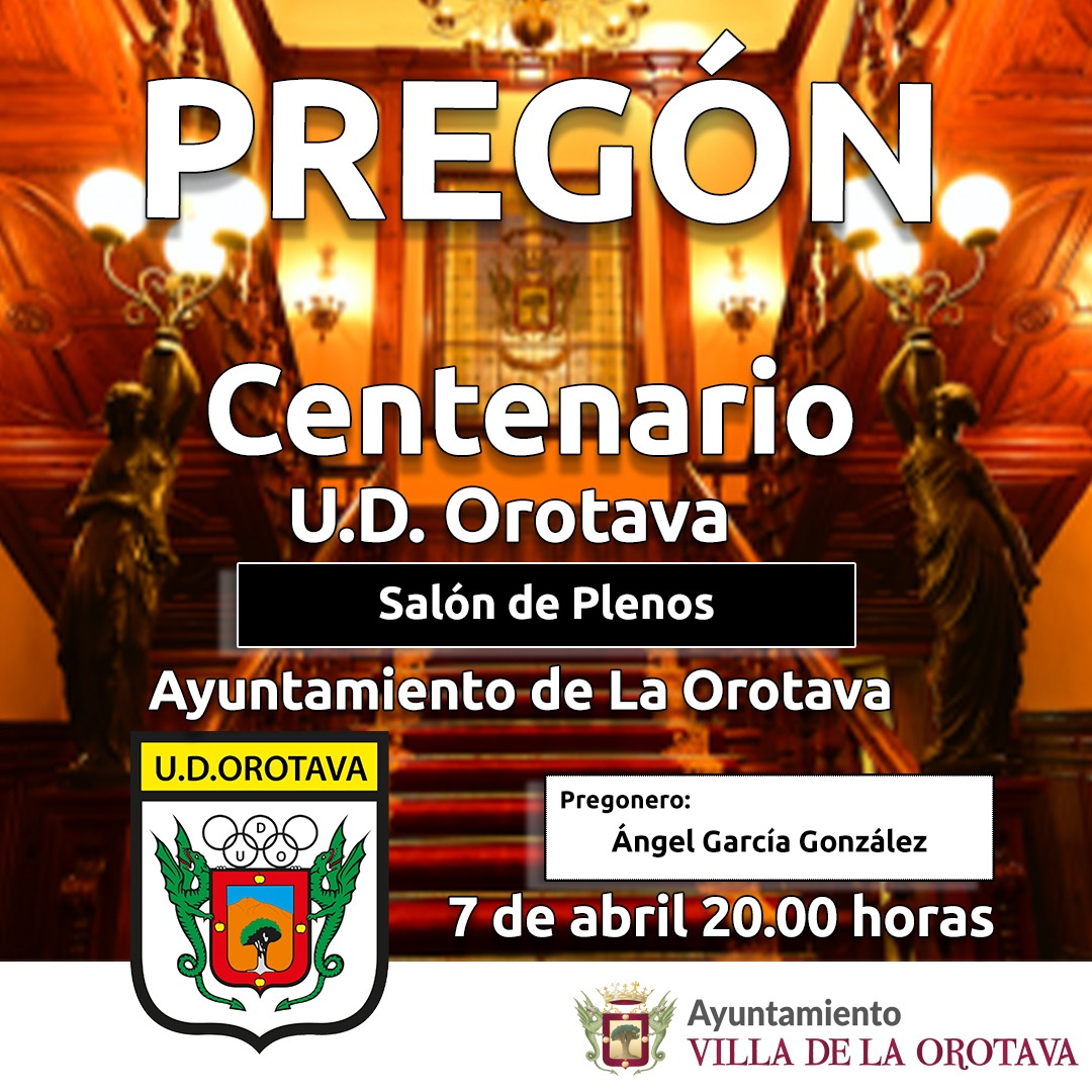 Jueves, 7 de abril de 2022.  Pregón con motivo del Centenario de la U.D. Orotava A las 20:00 horas, en el salón de Plenos del Ayuntamiento