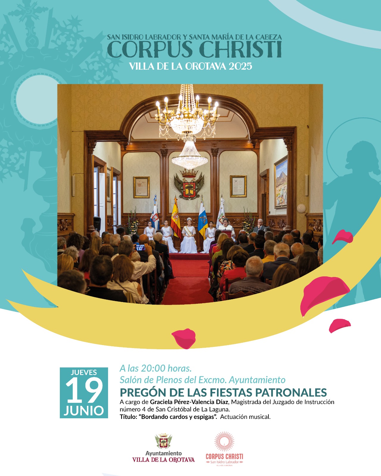 Comienzan las celebraciones del Corpus Christi en la Villa de La Orotava con el tradicional pregón. Un acto lleno de simbolismo que da apertura oficial a nuestras fiestas, con palabras que nos conectan con la historia, la devoción y el sentir de nuestro pueblo.