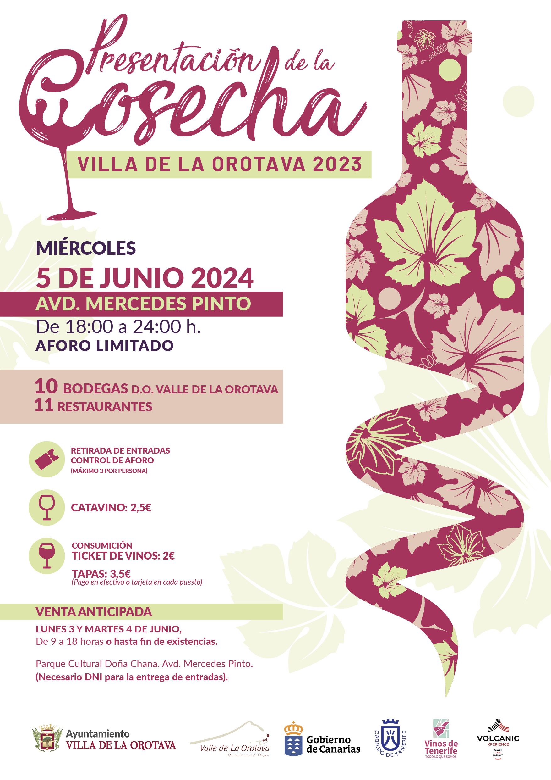 Aforo limitado. Entrada gratuta, pero es necesario presentar invitación para entrar al recinto. Las invitación se podrán recoger, junto a los tickets para consumición de vinos y catavinos, a partir del lunes 3 de junio en el Parque Cultural Doña Chana, de 9.00 a 18.00 horas, hasta fin de existencias. Una persona solo podrá retirar tres invitaciones por persona.