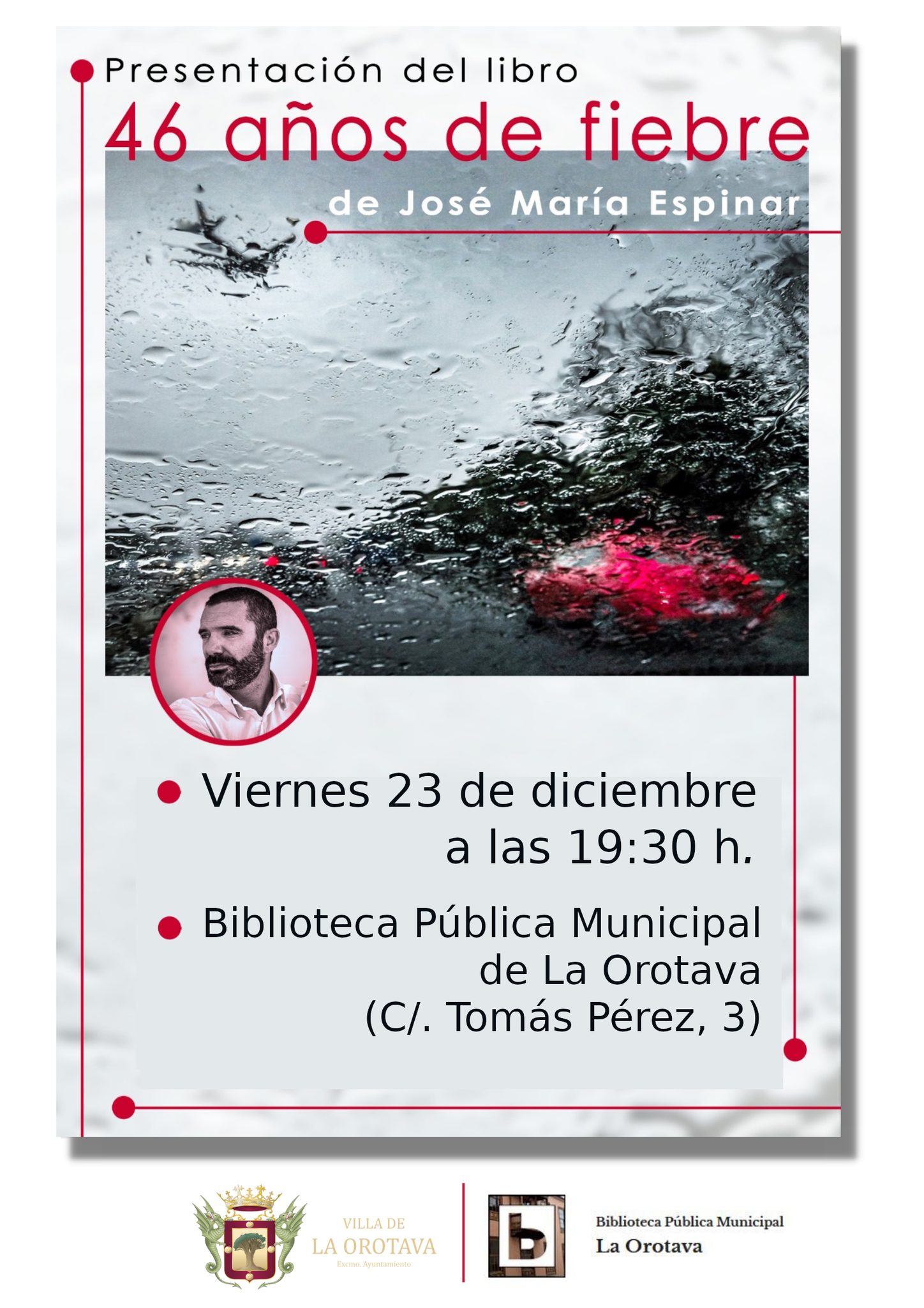 El viernes 23 de diciembre a las 19:30 horas el escritor José María Espinar, presentará su libro "46 años de fiebre", un autor que repite en esta Biblioteca después de su charla didáctica «La asombrosa historia de 16 palabras que tú creías normales.»