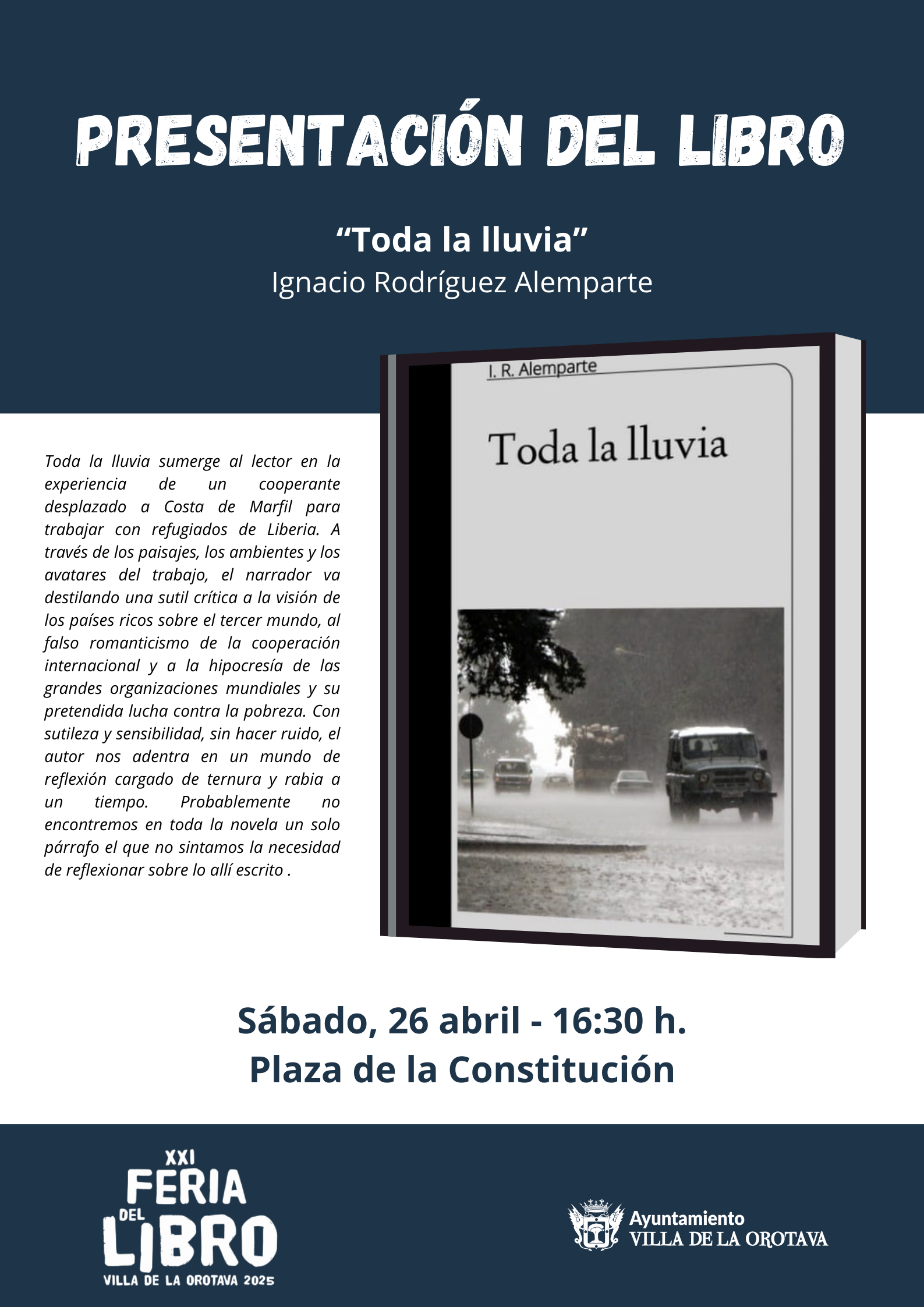 Toda la lluvia, de Ignacio Rodríguez Alemparte, se presenta el 26 de abril a las 16:30 h en la Plaza de la Constitución, dentro de la programación de la XXI Feria del Libro Villa de La Orotava 2025.