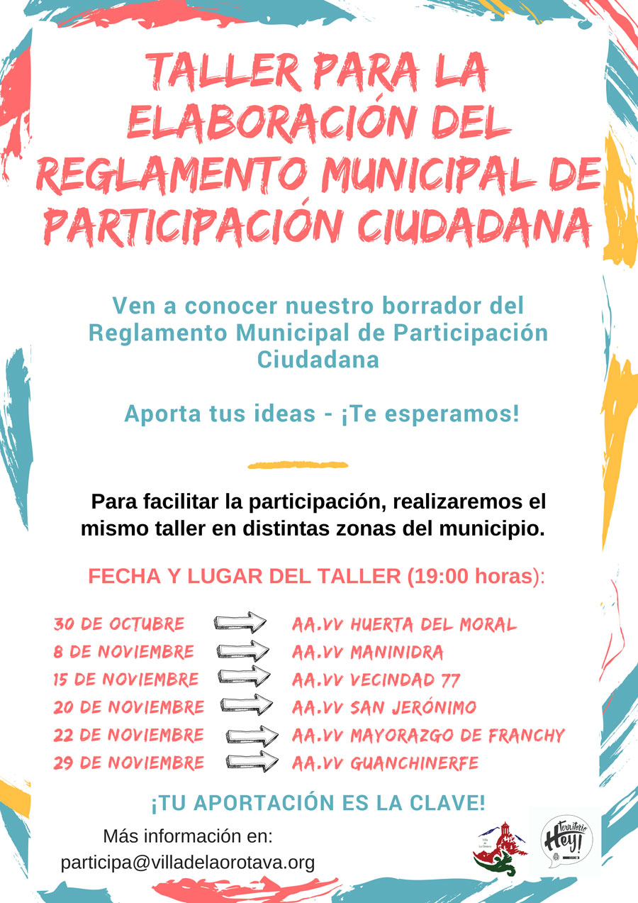 Dentro de los objetivos de la Concejalía de Participación Ciudadana se encuentra la aprobación de un Reglamento de Participación Ciudadana como norma municipal que regule la relación entre la ciudadanía y el Ayuntamiento, garantizando un funcionamiento eficaz y transparente de la acción pública municipal y facilitando la participación de los vecinos y vecinas en la toma de decisiones.
