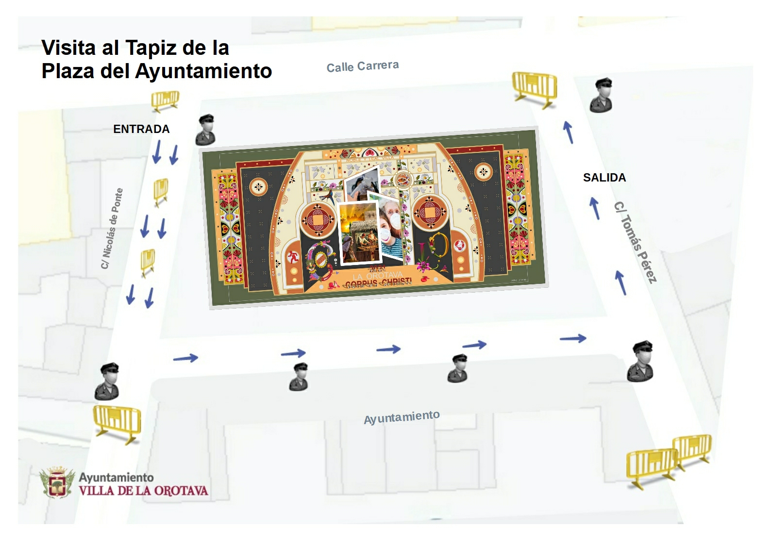 La entrada se hará desde la calle Nicolás Ponte, accediendo al pasillo del Ayuntamiento, y saliendo por la calle Tomás Pérez