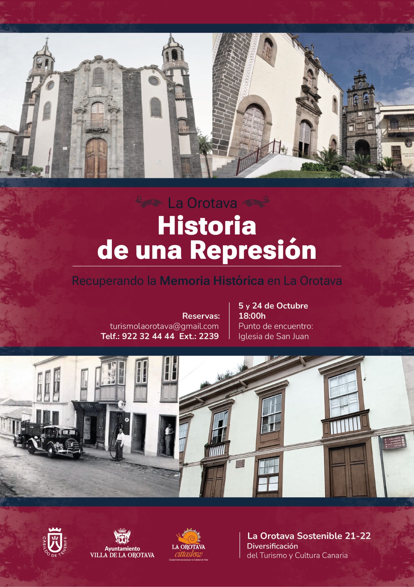 Los días 5 y 24 de octubre, se llevará a cabo una ruta guiada por la Villa bajo el título “La Orotava: Historia de una Represión” organizada por el grupo de trabajo formado por el diplomado en Turismo y el graduado en Historia del Proyecto “La Orotava Sostenible 21-22”.