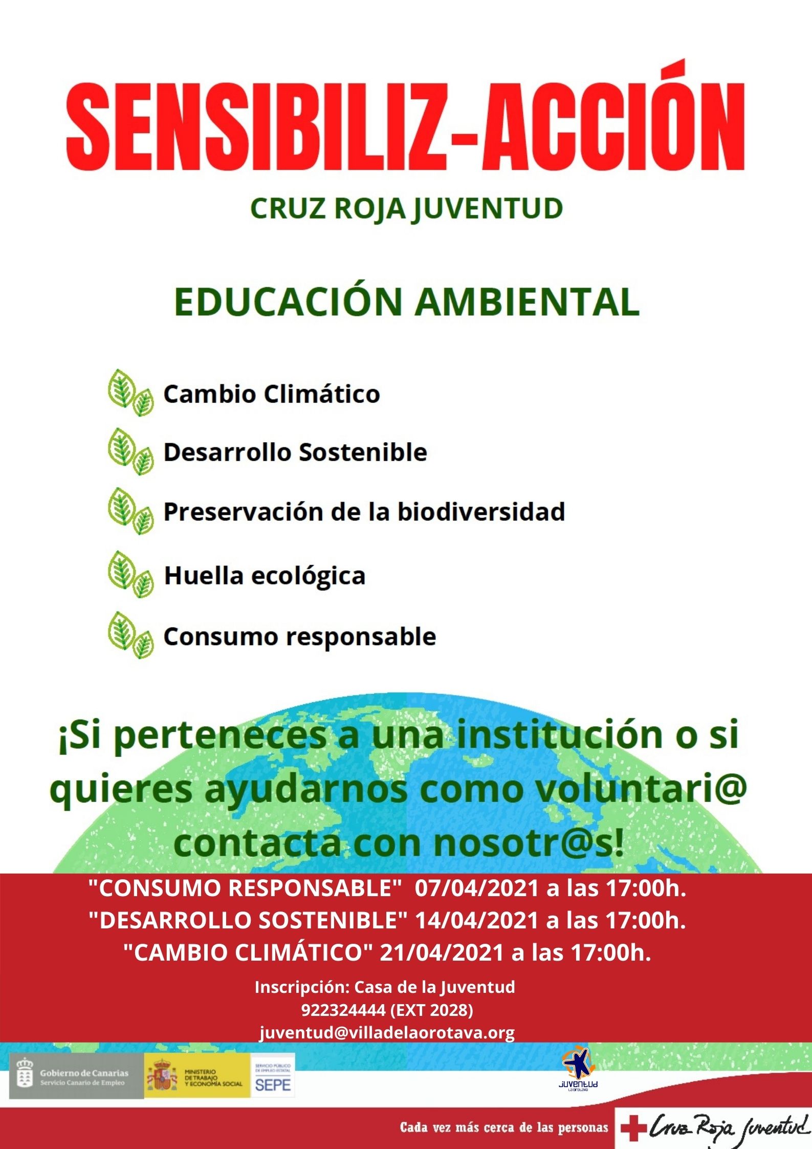 Cruz Roja Juventud Educación Ambiental: Cambio Climático; Desarrollo Sostenible; Preservación de la Biodiversidad; Huella Ecológica y Consumo Responsable. ¡Si perteneces a una institución o si quieres ayudarnos como voluntario/a contacta con nosotros/as! "Consumo Responsable". 7 de abril de 2021, a las 17:00 horas. "Desarrollo Sostenible". 14 de abril de 2021, a las 17:00 horas. "Cambio Climático". 21 de abril de 2021, a las 17:00 horas. Inscripción en Casa de la Juventud. Teléfono: 922 324 444 (Ext. 2028) Email: juventud@villadelaorotava.org