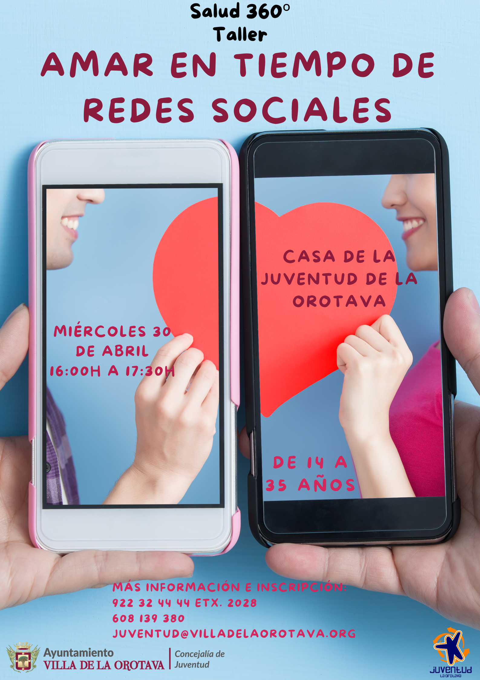 Te invitamos a participar en el taller "Amar en tiempo de redes sociales", el próximo 30 de abril, de 16:00 a 17:30 horas, en la Casa de la Juventud de La Orotava. Está dirigido a jóvenes entre 14 y 35 años.