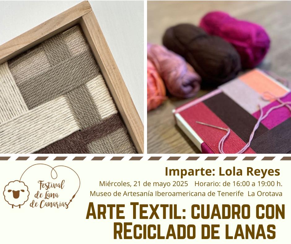 Taller "Arte Textil: Cuadro con reciclado de lanas" En el marco del Festival de Lana de Canarias, te invitamos a participar en este taller impartido por Lola Reyes, donde aprenderás a crear un cuadro textil reutilizando restos de lana. Una propuesta creativa y sostenible para dar nueva vida a los materiales.
