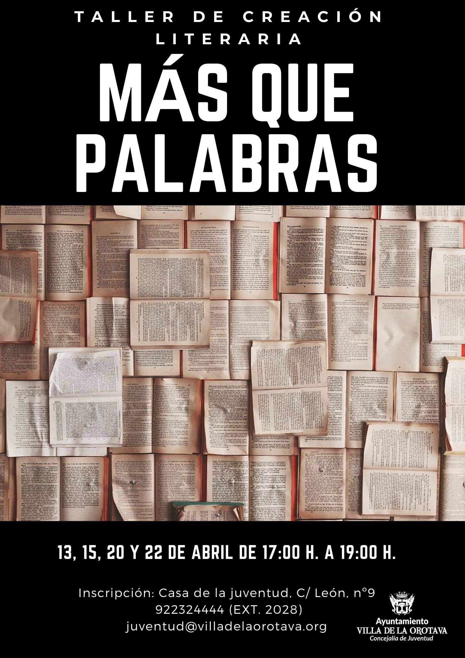 Fecha/Hora: Martes, 13 Abril, 2021Lugar: La Orotava'Más que palabras' Descripción: 13, 15, 20 y 22 de abril. De 17.00 a 19:00 horas #LaOrotava #CasadelaJuventud ·#Tallerliterario