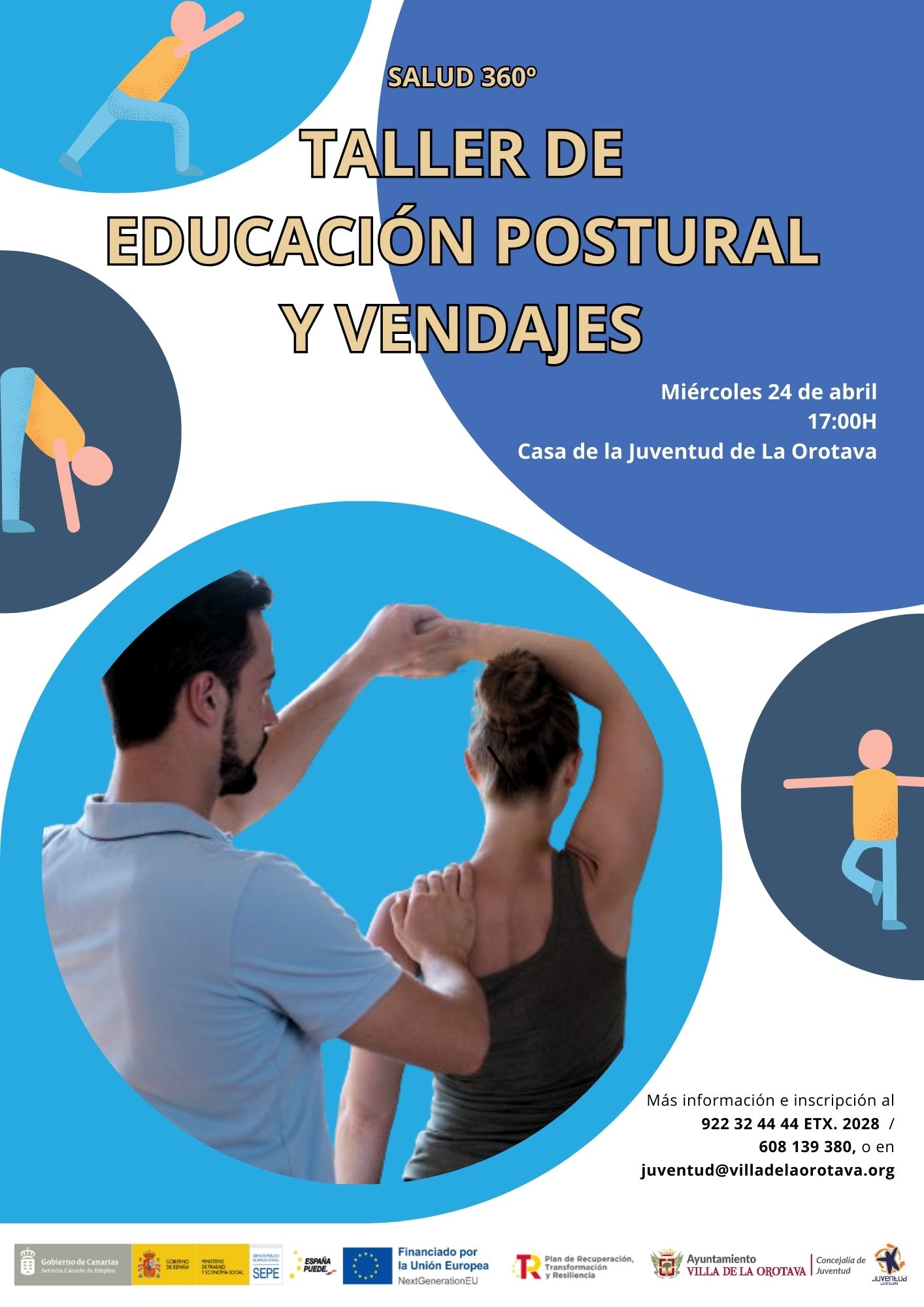 El próximo miércoles 24 de abril tendrá lugar el "Taller de Educación Postural y Vendajes" en la Casa de la Juventud de La Orotava, a las 17:00 horas.