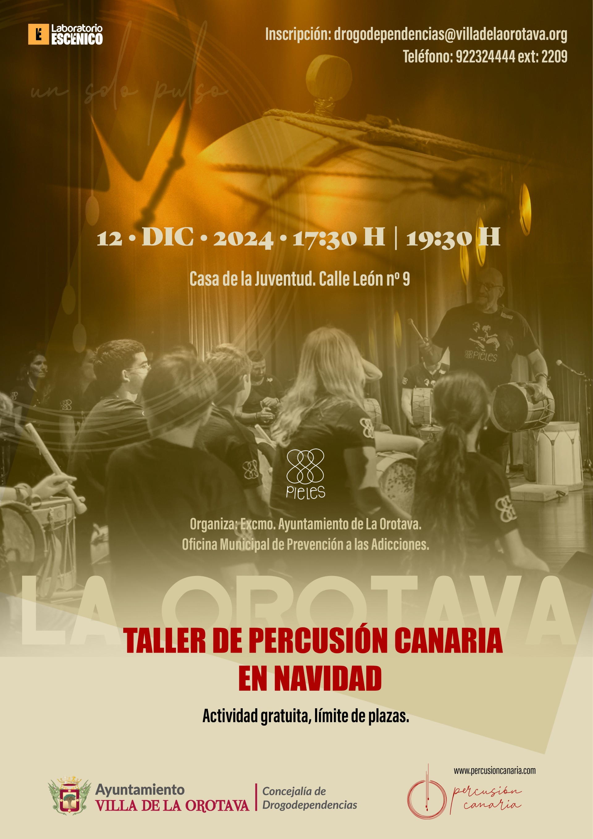 El próximo 12 de diciembre, te invitamos al Taller de Percusión Canaria en la Casa de la Juventud de La Orotava. Una actividad organizada por el Excmo. Ayuntamiento de La Orotava, Oficina Municipal de Prevención a las Adicciones e impartido por: Laboratorio Escénico (Pieles)