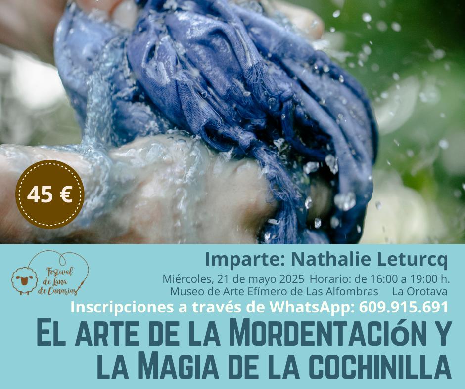 Taller "El arte de la mordentación y la magia de la cochinilla" Descubre el fascinante proceso de preparación de fibras naturales para el teñido con mordientes y experimenta con los intensos tonos de la cochinilla. Un taller impartido por Nathalie Leturcq que une tradición, ciencia y creatividad.