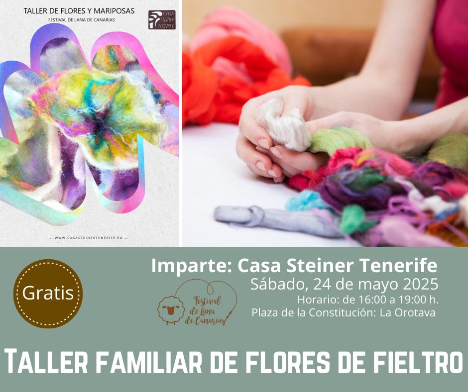 En el marco del Festival de Lana de Canarias, te invitamos a un taller familiar donde podrás crear flores de fieltro con diferentes colores y formas. Una actividad divertida y creativa para disfrutar en familia. Impartido por Casa Steiner Tenerife.