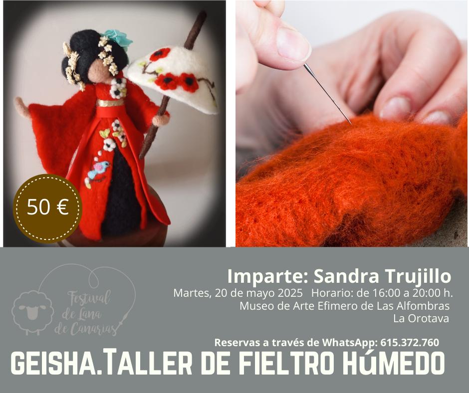Taller "Geisha" de fieltro húmedo En el marco del Festival de Lana de Canarias, te invitamos a participar en este taller creativo impartido por Sandra Trujillo, donde aprenderás la técnica del fieltro húmedo para crear piezas inspiradas en la figura de la geisha.
