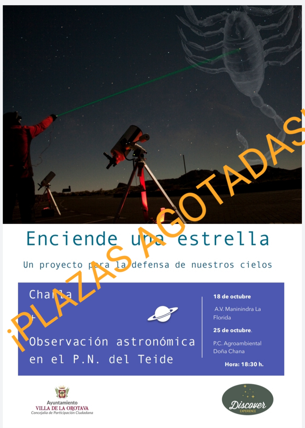 Se llevarán a cabo dos charlas con observación en el Parque Nacional del Teide durante el mes de octubre con el objetivo de concienciar sobre la contaminación lumínica en el municipio y la importancia del astro turismo. Organizadas desde la Concejalía de Participación Ciudadana