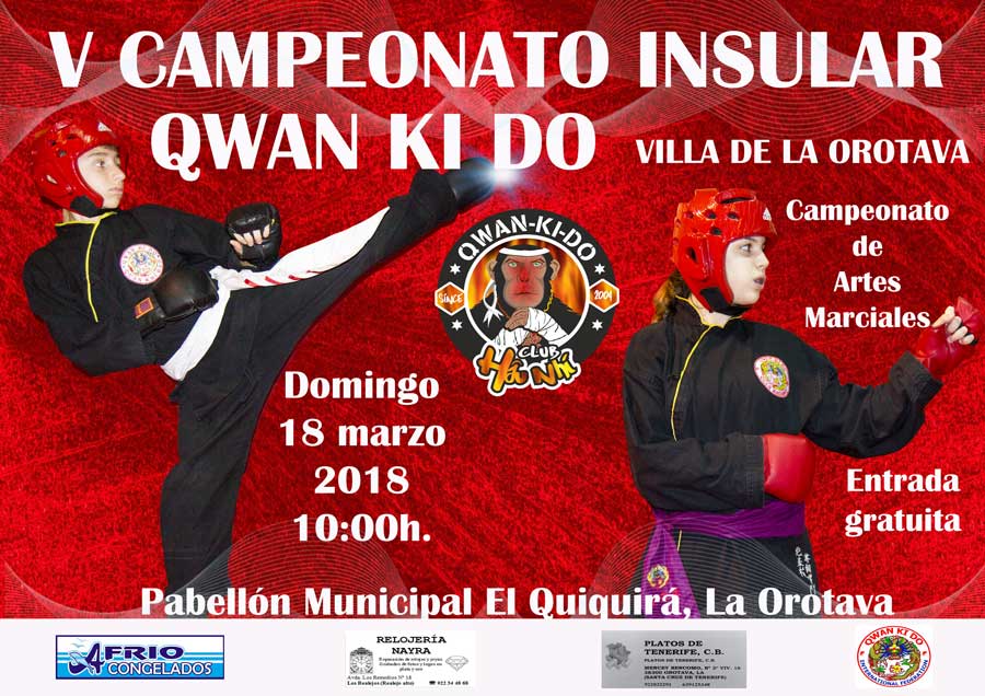 Este domingo, 18 de marzo, a partir de las 10 horas, en el Pabellón Municipal el Quiquirá, tendrá lugar el V Campeonato Insular de Qwan Ki Do, infantil, cadete y junior, campeonato de artes marciales. Entrada gratuita.