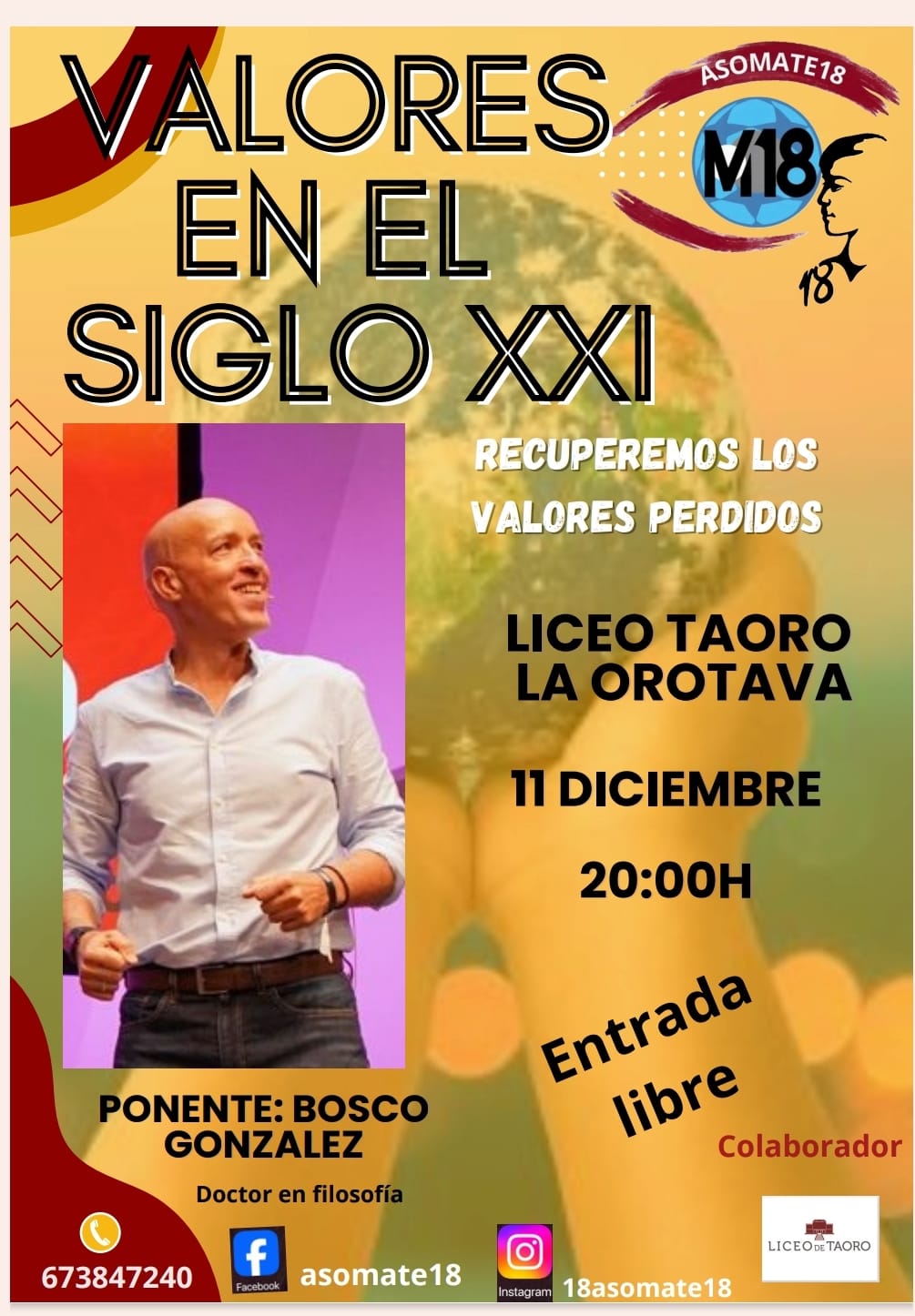 El próximo 11 de diciembre, el Liceo Taoro de La Orotava acogerá la conferencia "Valores en el Siglo XXI", impartida por Bosco González, doctor en filosofía.